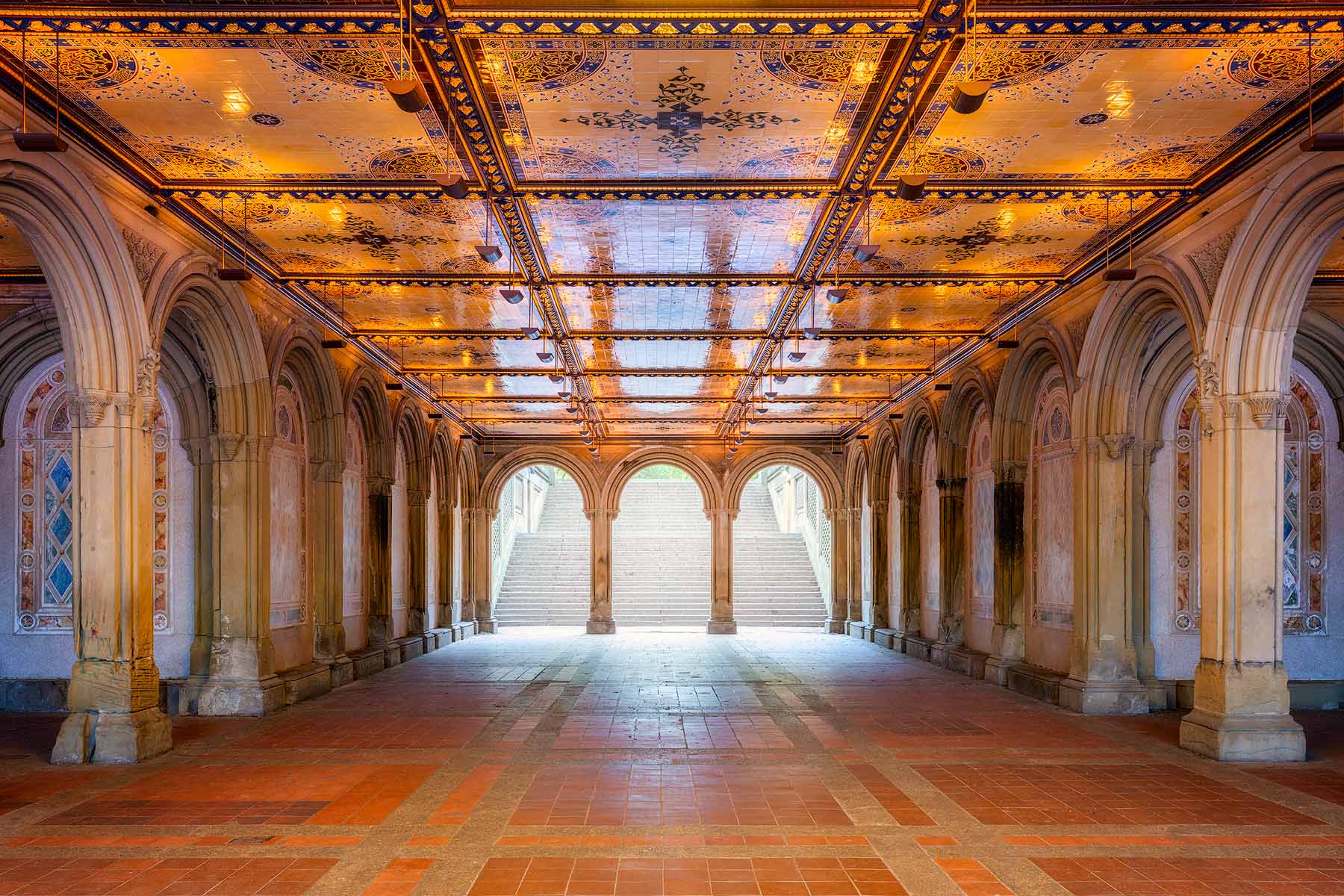 This beautiful photograph of Bethesda Terrace in Central Park captures the space with an almost ethereal elegance. The ornate Minton tile ceiling and graceful arches frame the scene with intricate detail, while soft, radiant light pours in from the stairway beyond, illuminating the corridor with a warm, inviting glow. The composition highlights both the architectural grandeur and the quiet, atmospheric beauty that makes this iconic New York City landmark feel timeless.