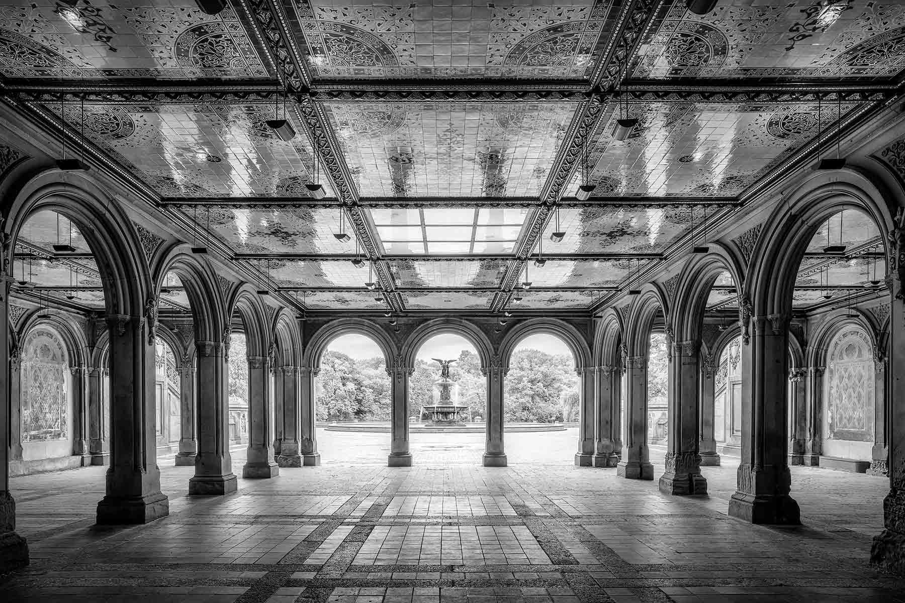 This striking black and white image reveals the elegant lower arcade of Bethesda Terrace in Central Park, New York. Without the distraction of color, the intricate lines and patterns of the Minton-tiled ceiling stand out in sharp contrast, emphasizing the symmetry of the ornate arches that frame the view toward the Bethesda Fountain and the Angel of the Waters statue outside. The interplay of light and shadow creates a serene, almost cathedral-like atmosphere, inviting viewers to pause and appreciate the craftsmanship. As one of the park’s most beloved landmarks, the scene feels both grand and intimate—a place where art, history, and nature converge.