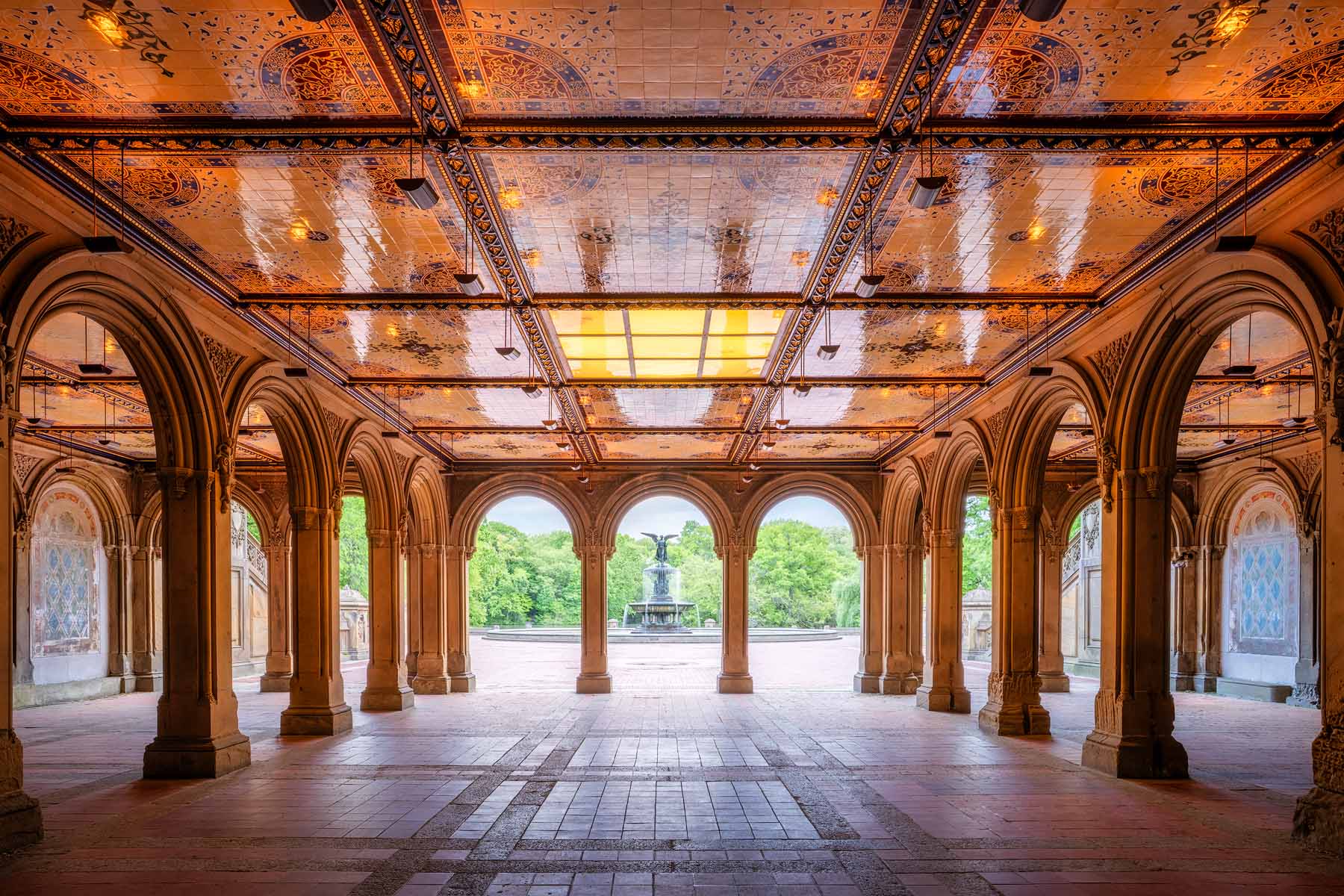 This beautiful image captures the elegant lower arcade of Bethesda Terrace in Central Park, New York. Warm light reflects off its intricately tiled Minton ceiling, highlighting the ornate arches that open toward the iconic Bethesda Fountain and the Angel of the Waters statue outside. The richly detailed architecture and glowing ceiling create a serene, almost cathedral-like atmosphere, inviting visitors to pause and take in the craftsmanship. As one of the park’s most beloved landmarks, it feels both grand and intimate, a space where art, history, and nature meet.
